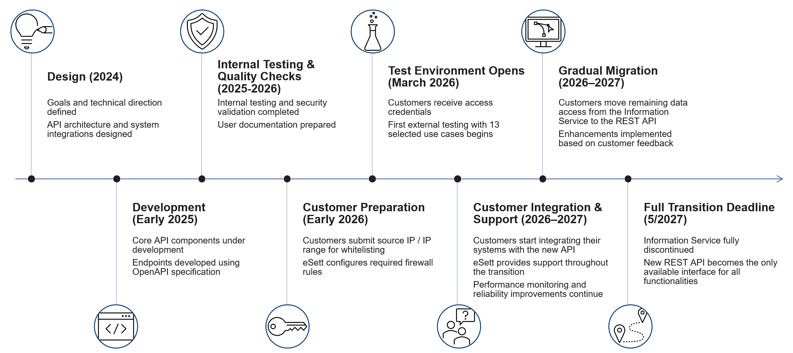 The eSett Information Service will be discontinued after 2027, and all functionalities will be fully available through the new REST API.