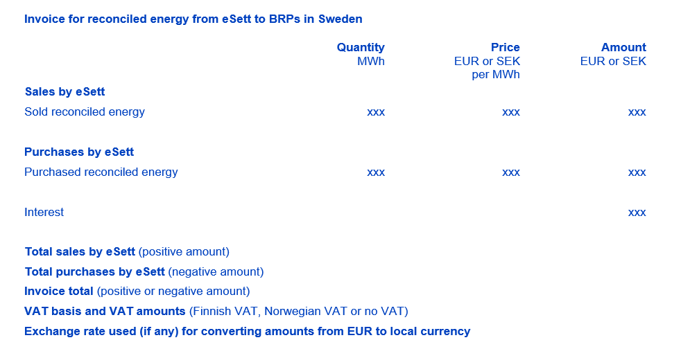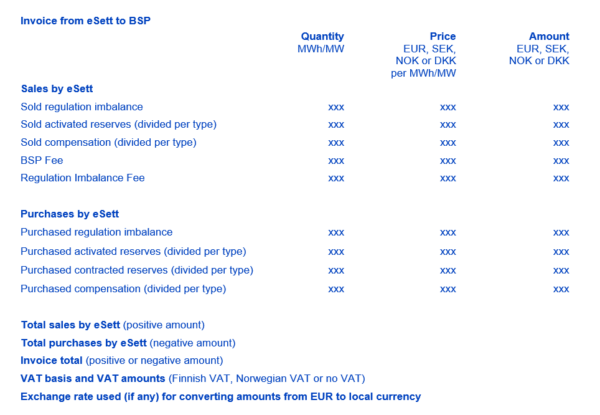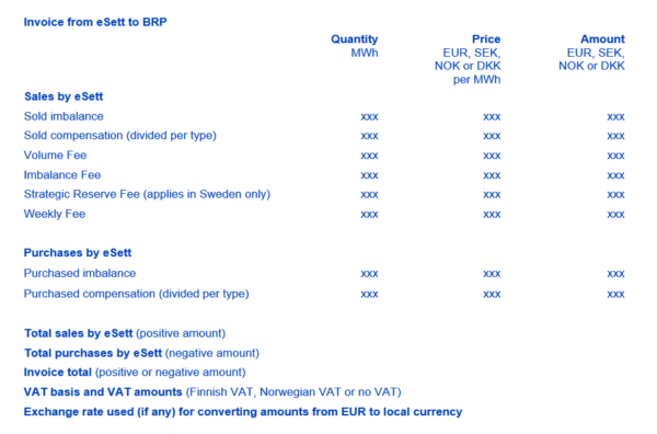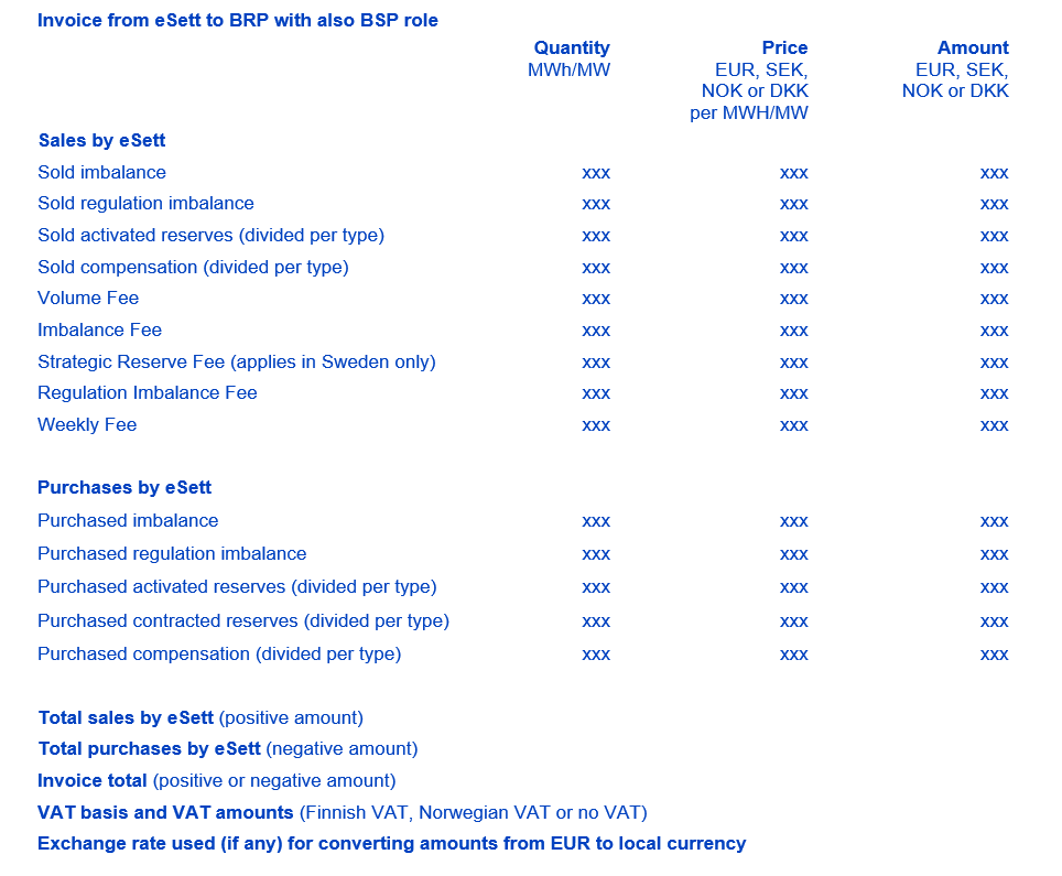 - Invoicing handles eSett’s invoicing of BRPs, based on realised imbalances and BSPs based on balancing services. See Chapter 8 Invoicing