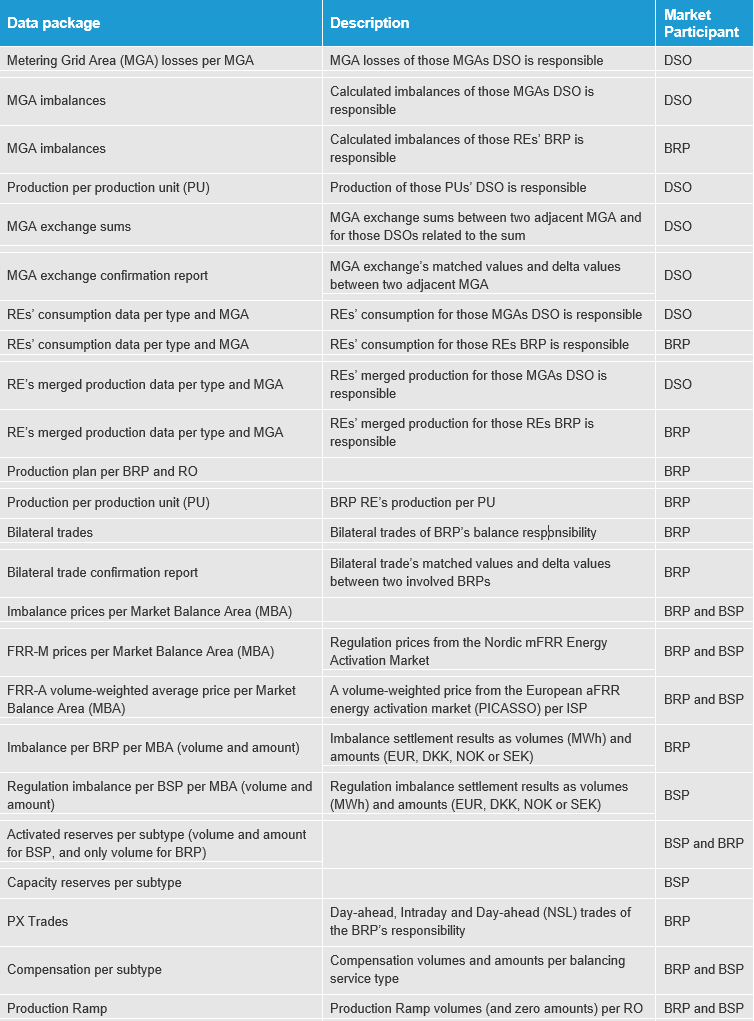 Most data packages contain data from D-14 to D-1, where D refers to current day. For some data packages, e.g. imbalance settlement results, there are four different versions of each data package: