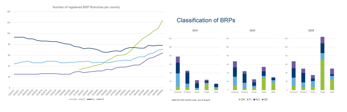 The number of Balance Responsible Parties (BRPs) continued to increase during the third quarter, with Denmark contributing most new entrants to the market. (left line chart). When BRPs are roughly categorized based on their portfolio (right bar charts), new BRPs are mostly traders without physical generation or consumption assets. Their activity is concentrated in the power exchange (PX) market, contributing to liquidity but not directly impacting physical balancing. This trader-heavy growth pattern is consistent across all four Nordic countries. The number of traders has increased 2023 to 2025 mostly in Denmark and Finland (130 %) and slightly less in Norway (100%) and Sweden (50%).