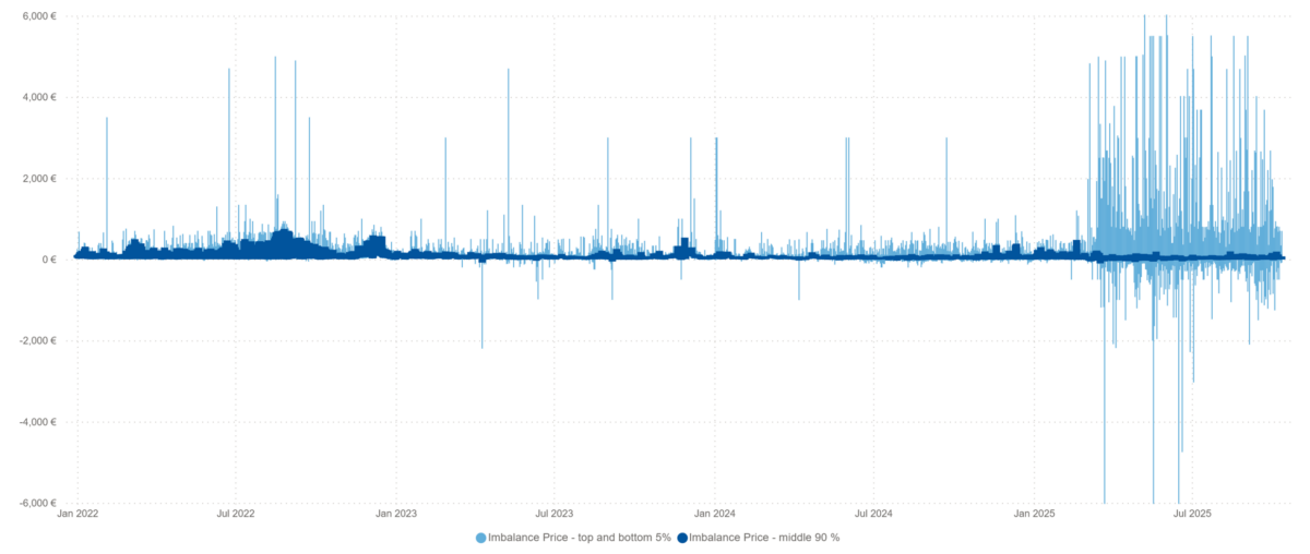 In Q3 2025, the market continued to exhibit significant price volatility, consistent with the instability observed in the aftermath of the mFRR EAM launch on March 4, 2025. While 90% of imbalance prices across Nordic MBAs (dark blue bars) stayed within reasonable limits, the top and bottom 5% of imbalance prices (light blue bars) continued to exhibit significant deviations. Q3 of 2025 showed some decline in price volatility particularly in negative prices, driven by overall market adjustments and manual price interventions by TSOs.