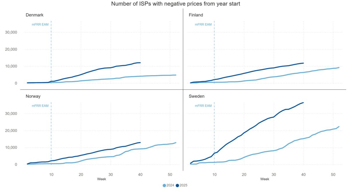 In 2025, the Nordic electricity market has seen increase in ISPs with negative prices. By the end of Q3 of 2025, the number of recorded negative prices in all countries have already surpassed the total of 2024 (graphs below). As the significant growth in negative prices happened after the mFRR EAM go live in Q2, the number of negative prices in Q3 of 2025 have been closer to Q3 of 2024. Denmark and Sweden are projected to experience a substantial increase in negative price occurrences in 2025 relative to 2024.