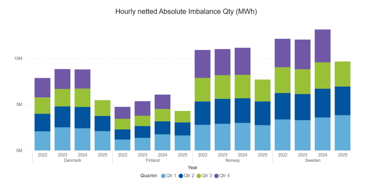 Focusing on Q3 of 2025 compared to Q3 of 2024, imbalance volumes decreased slightly in all countries. The total absolute imbalance volumes for 2025 compared to 2024 is expected to be decreased in all counties except Sweden.